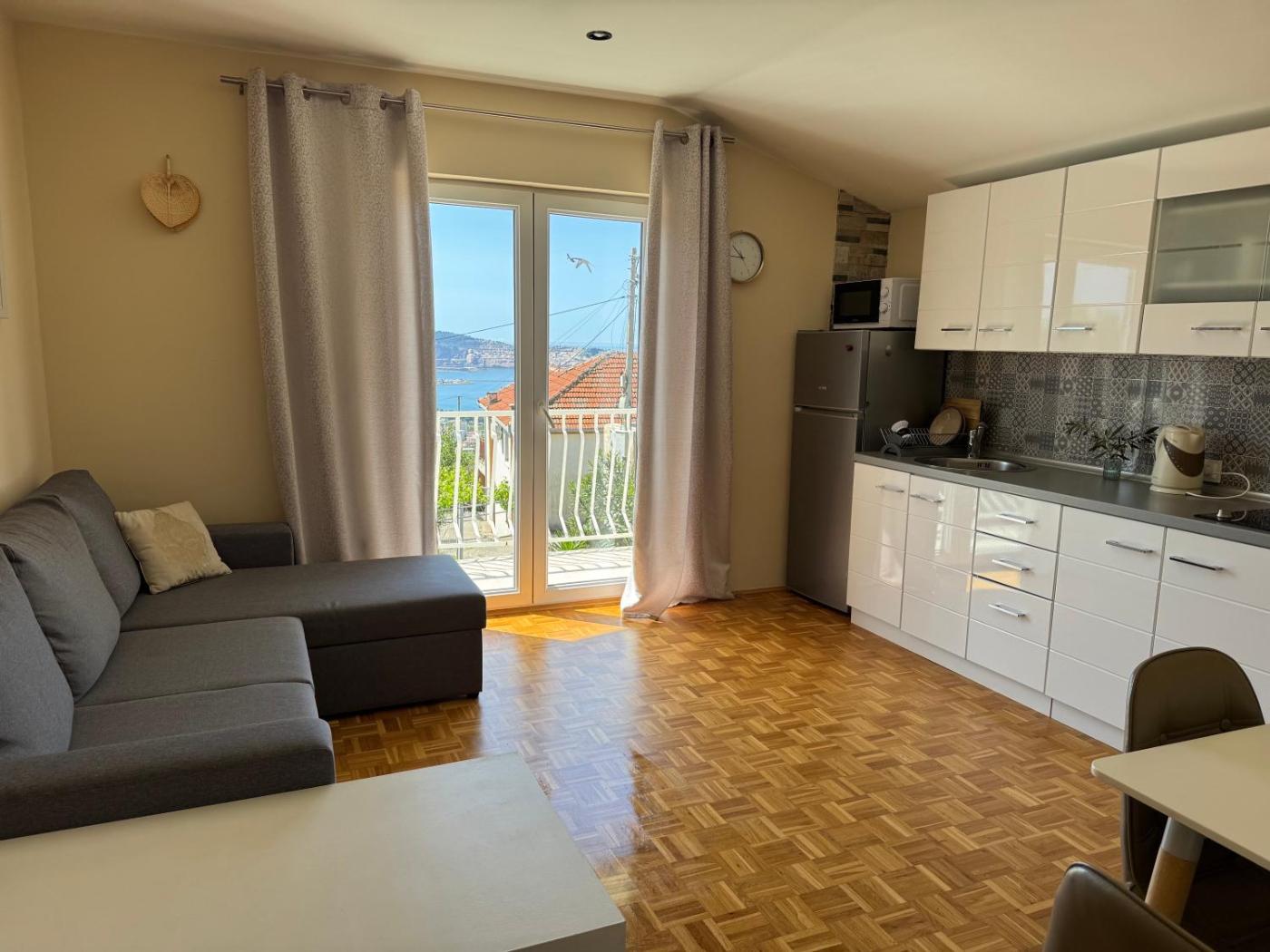 One-Bedroom Apartment. Boasting a private entrance, this air-conditioned apartment includes 1 living room, 1 separate bedroom and 1 bathroom with a shower and a hairdryer. Guests will find a stovetop, a refrigerator, kitchenware and a tea and coffee maker in the fully equipped kitchen. The apartment also features a barbecue. Featuring a balcony with sea views, this apartment also offers a washing machine and a flat-screen TV with satellite channels. The unit has 2 beds.